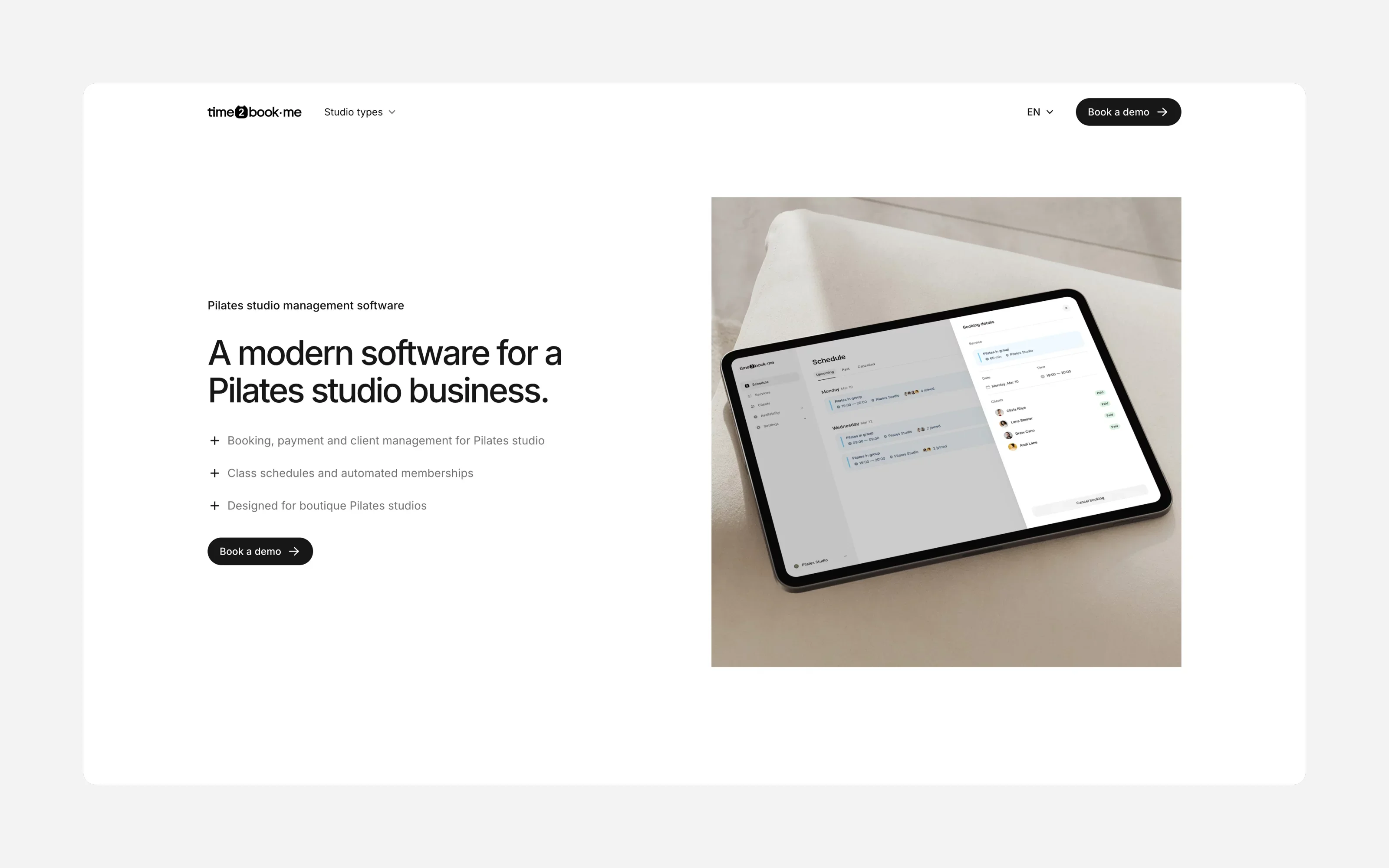 Time2book is a modern booking platform built for service-based businesses like Pilates studios. It helps you manage class schedules, payments, and clients with ease—all in one simple, elegant interface.