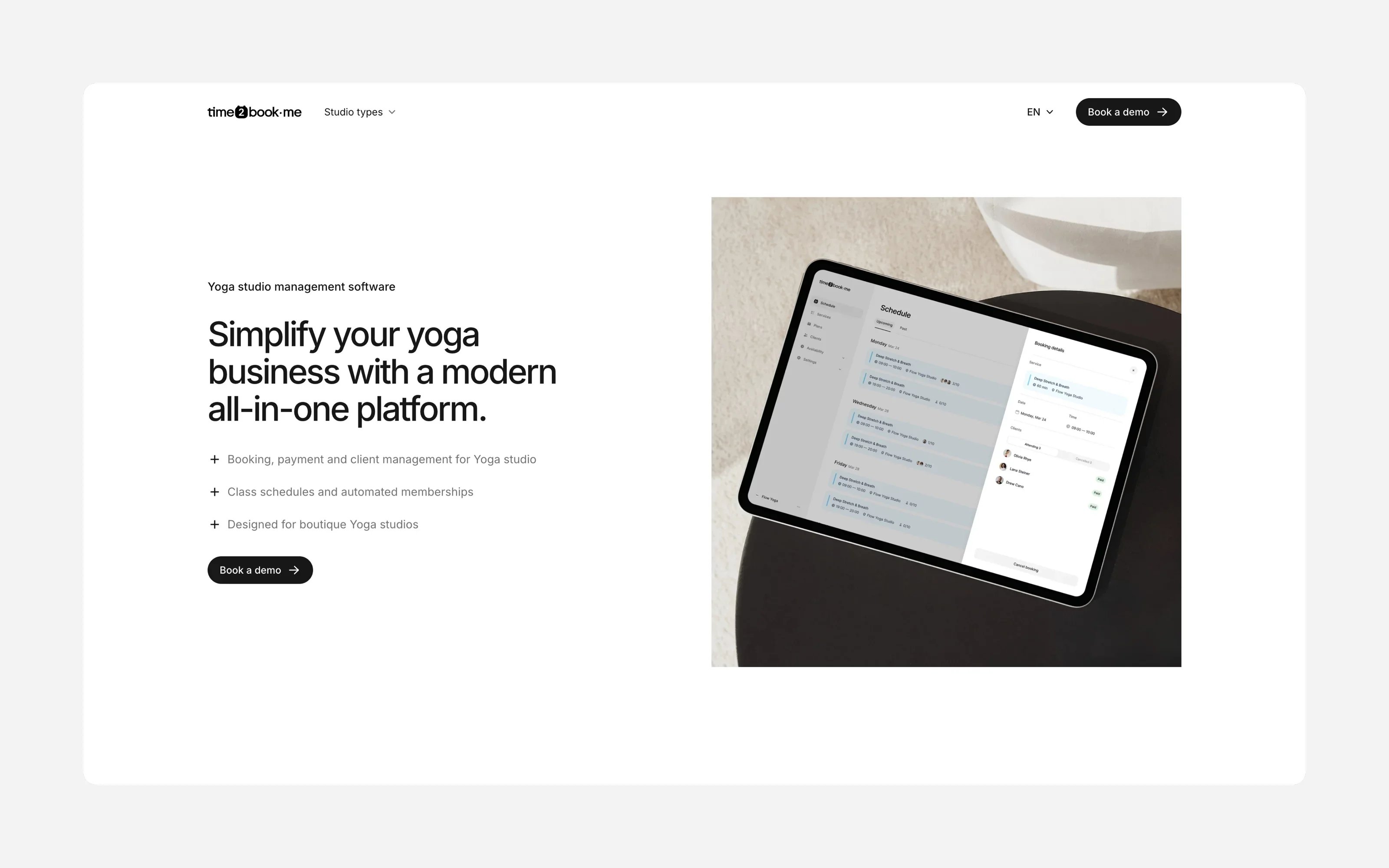 Time2book is a modern, lightweight booking and payment platform built specifically for Pilates, yoga, fitness studios, and personal trainers. It focuses on a clean interface, zero complexity, and instant onboarding — ideal for reformer studios that want to go live fast.